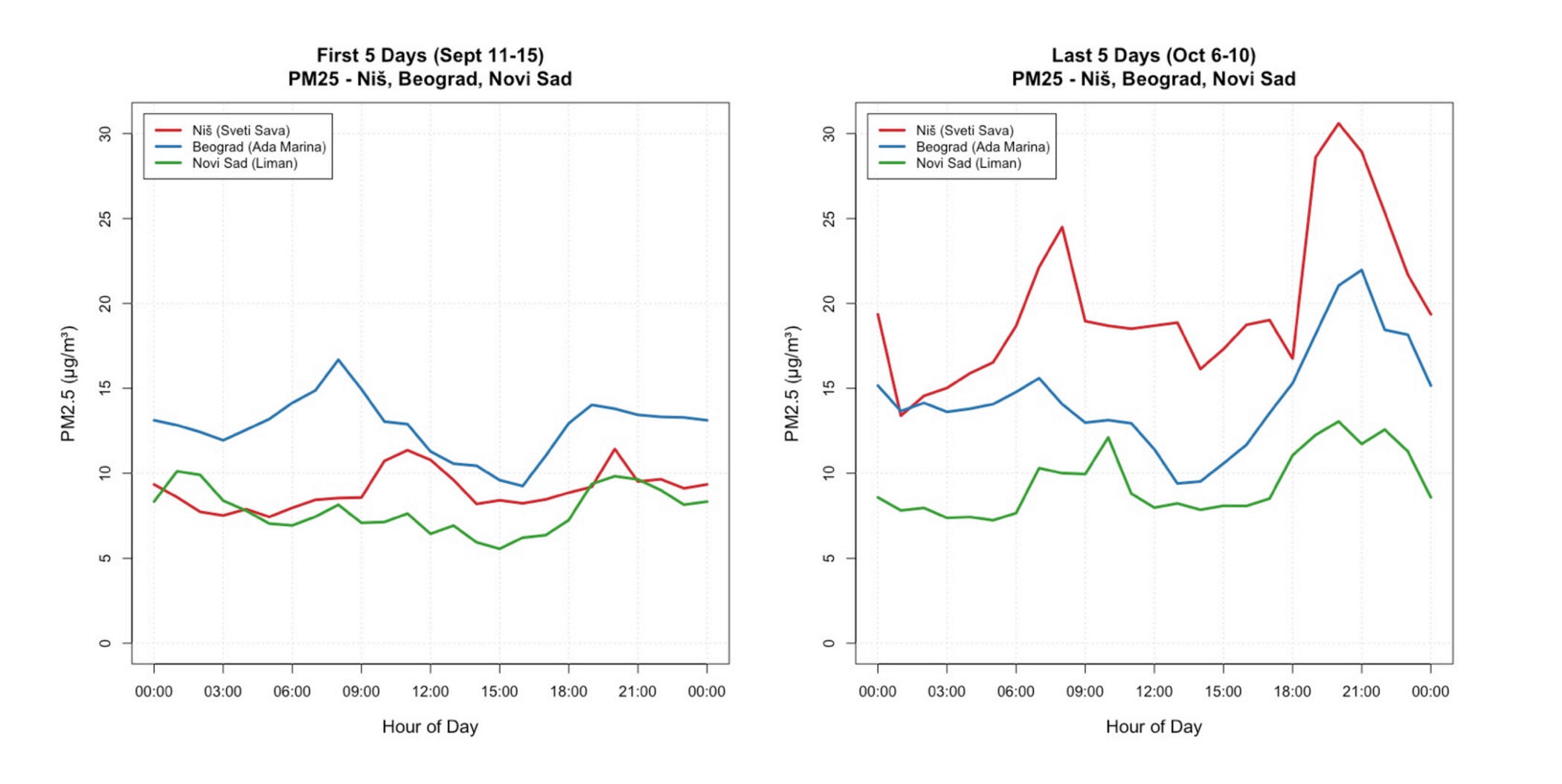 - Early‑season signals: In September–October 2025, Niš shows an evening rise in PM2.5 and NOx; SO₂ stays flat/low → fingerprint consistent with wood‑dominant residential heating.