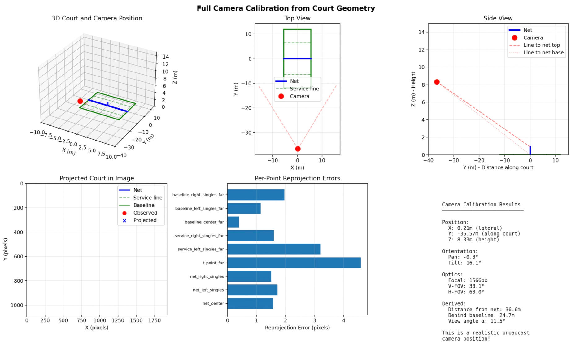 From a single TV frame, solve a pinhole camera model against standard tennis‑court geometry to recover x, y, z, focal length, pan, and tilt, and then compare across events/courts.